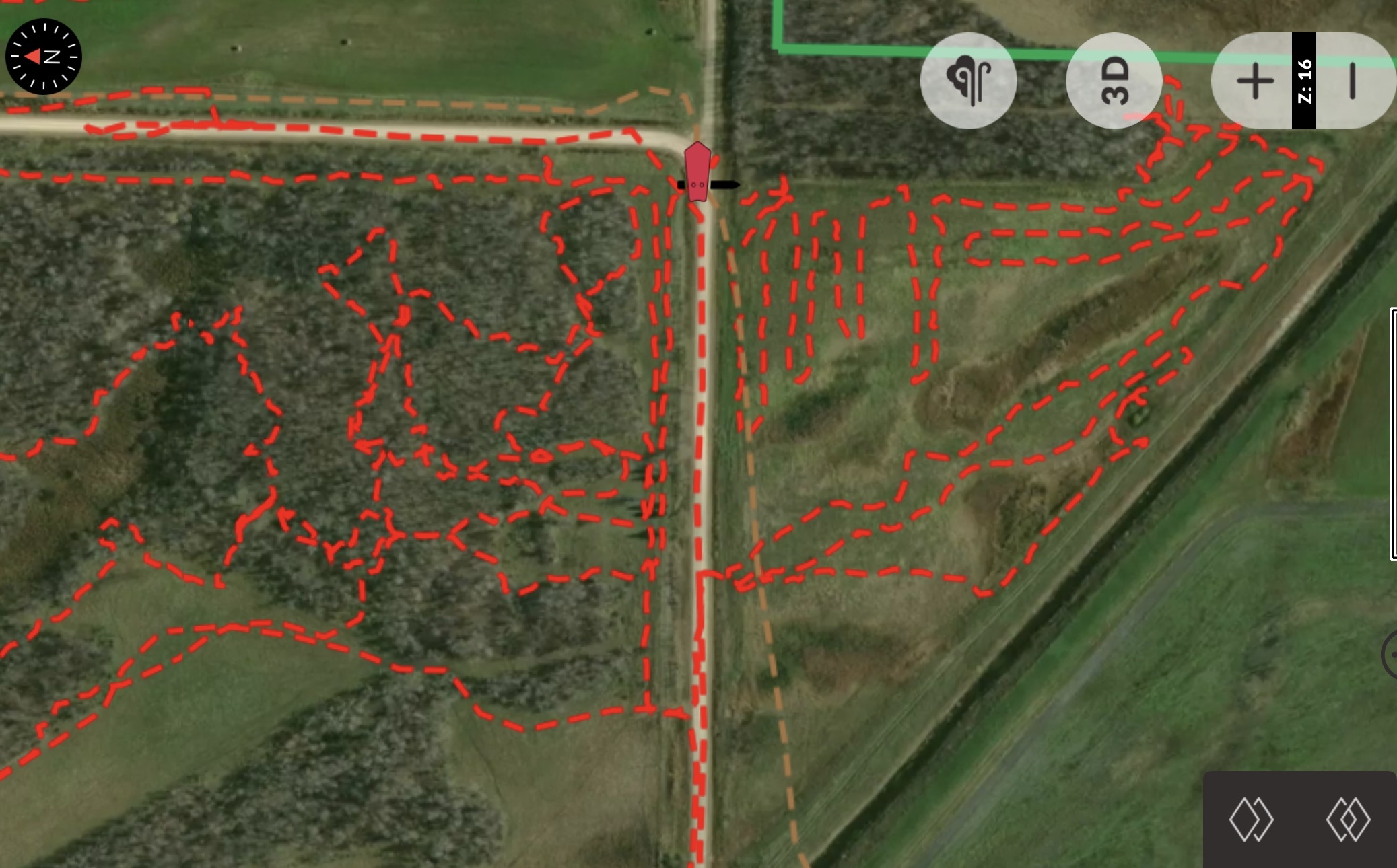 Une fois que le champ a été entièrement couvert, je me concentre sur les bords du champ et les lignes des buissons, en particulier sur les 20 à 30 premiers mètres dans les buissons. Les bordures orientées vers le sud sont prioritaires. Ces endroits reçoivent le plus de soleil en milieu de journée pendant l'hiver, ce qui en fait des zones de repos de choix pour les cerfs qui cherchent à s'imprégner de chaleur. Lorsque je me déplace le long de ces lisières, j'utilise iHunter pour marquer toutes les bonnes pistes qui pénètrent dans les buissons afin de les examiner plus en détail ultérieurement.