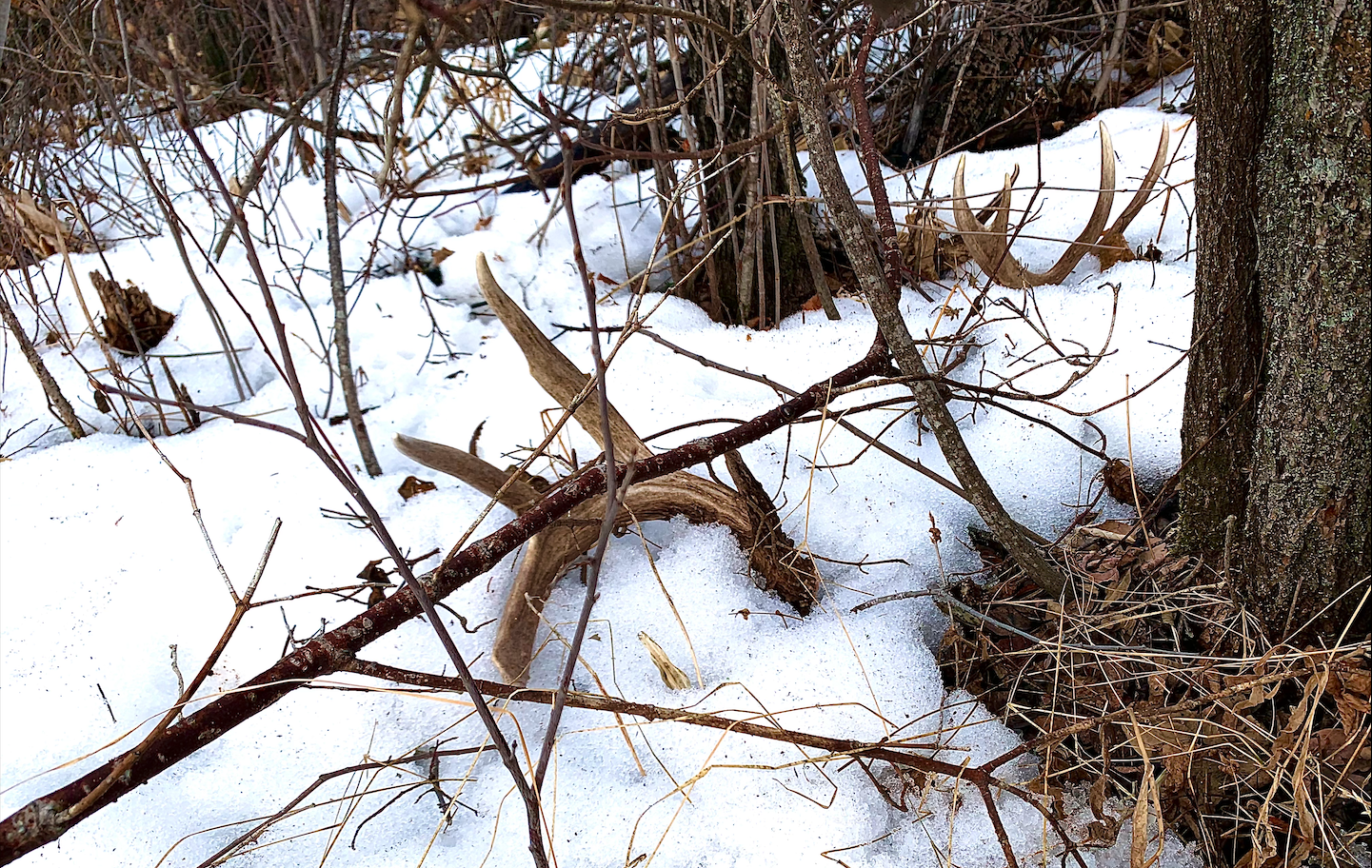 À cette époque, le niveau de neige dans la brousse a généralement baissé, ce qui facilite la marche et améliore la visibilité. À mesure que la neige fond, les bois perdus se détachent souvent joliment sur l'herbe morte et aplatie de l'année précédente. Pour moi, la chasse à la mue est devenue l'activité idéale de l'intersaison pour combler le fossé entre la fin de la pêche sur glace et le début des saisons de chasse à l'ours et à la dinde au printemps. Je continuerai jusqu'à ce que la nouvelle croissance printanière commence vraiment à prendre de l'ampleur. Une fois que la verdure fraîche commence à pousser, il devient beaucoup plus difficile de repérer les mues. Les dents blanches ou brunes qui se détachaient autrefois sur la toile de fond terne du début du printemps commencent à se fondre dans la couleur et le désordre de la nouvelle vie. La forêt s'épaissit, les sentiers sont de plus en plus envahis et les bois qui étaient autrefois faciles à voir peuvent soudainement disparaître dans le paysage. Le choix du moment est donc essentiel : sortir avant que les forêts et les champs ne reverdissent vous donne les meilleures chances de repérer ces trésors cachés.