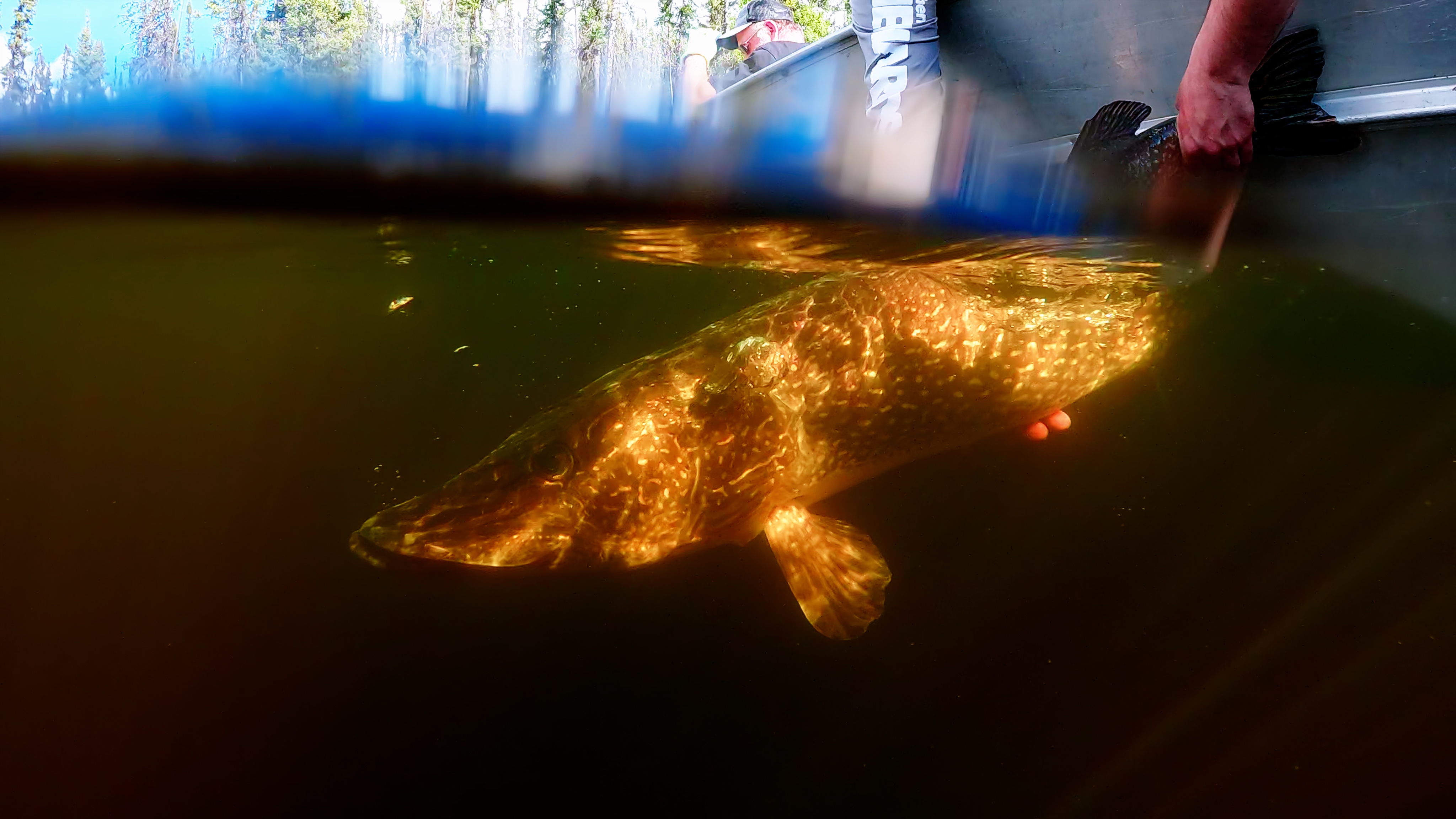 À quelques heures de la fin de la journée, nous nous sommes dirigés vers une nouvelle baie dans l'espoir de retrouver le succès que nous avions eu dans la baie précédente. À notre arrivée, nous nous sommes rendu compte que la pêche à vue ne serait pas aussi facile, mais comme l'eau était plus chaude, nous étions convaincus que les grands brochets seraient au rendez-vous là aussi. Après quelques lancers, Pat a hameçonné un très gros poisson. Ce mastodonte s'est battu avec acharnement avant que nous puissions le ramener à bord du bateau et le mettre dans l'épuisette. Nous étions tous ravis et après quelques photos rapides, nous avons remis le brochet à l'eau.