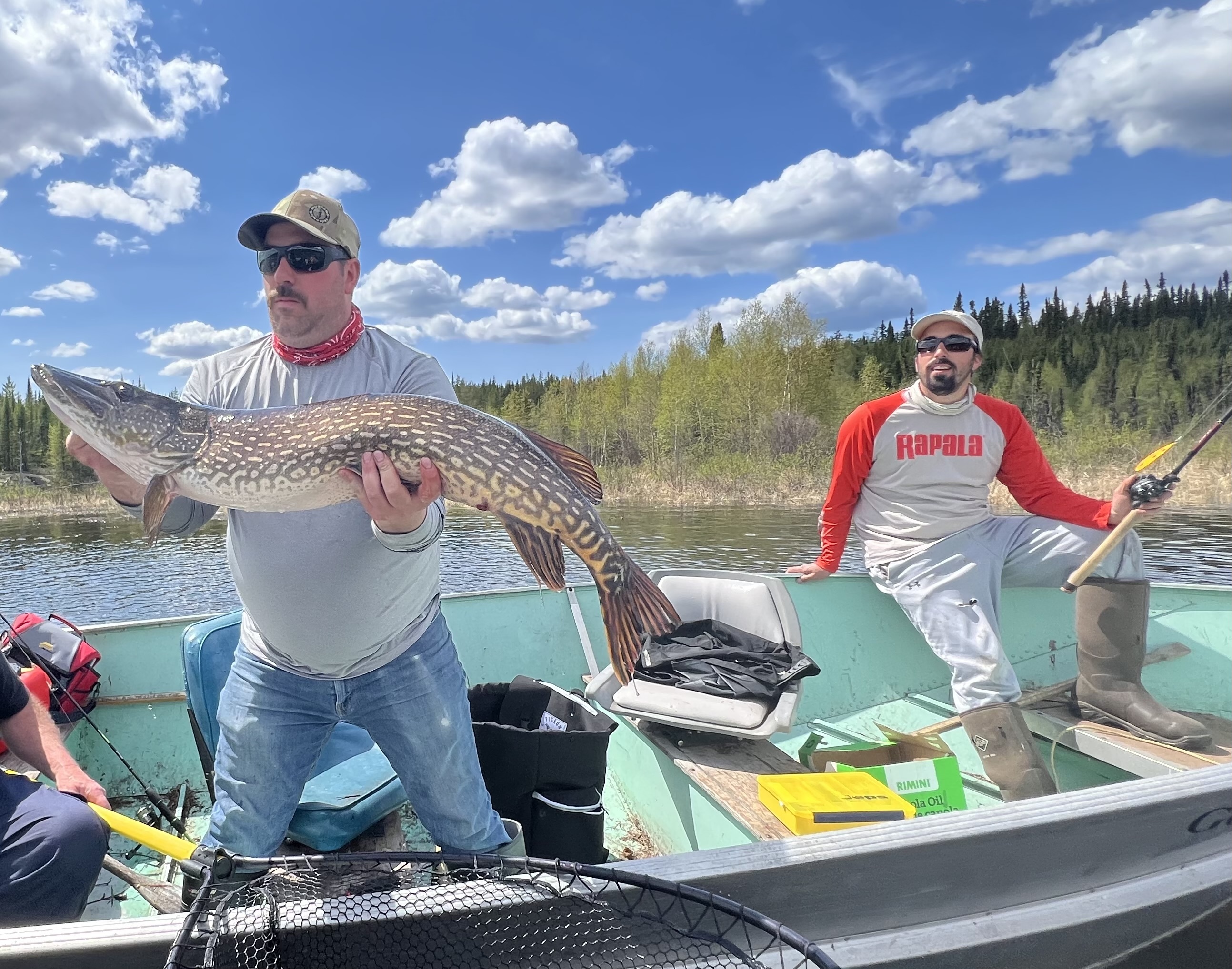 Tout de suite après, Pat a lancé son poisson nageur dans la même direction et, quelques secondes plus tard, le combat reprenait! Une autre bataille intense et voilà le poisson qui était de nouveau à bord du bateau, dans le filet. Nous étions tous un peu estomaqués par la journée de pêche que nous venions de passer, et clore la journée avec deux brochets trophées consécutifs, c'était vraiment la cerise sur le gâteau.